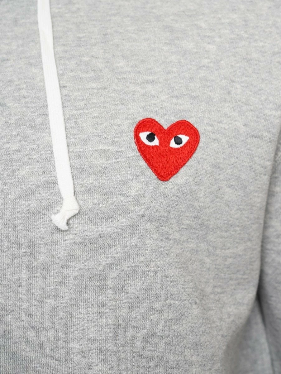 - Elevate your wardrobe with the iconic Comme Des Garçons PLAY T250 Red Heart Zip-Up Hoodie in Grey. This men’s designer hoodie combines comfort and style effortlessly.