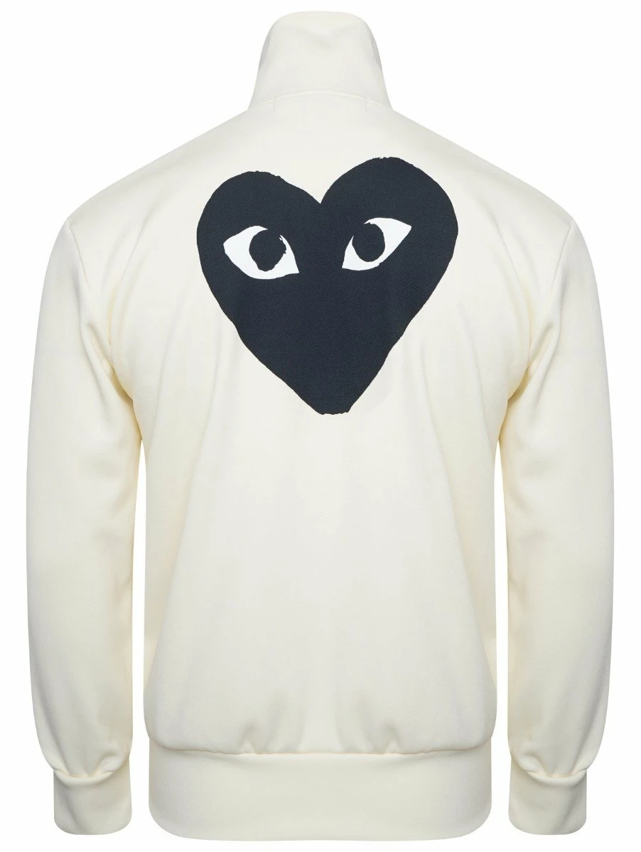 - The Comme Des Garçons PLAY T255 Black Heart Track Jacket in Ivory is a must-have for any fashion-forward wardrobe. Featuring the signature black heart logo, this jacket combines style and comfort effortlessly.