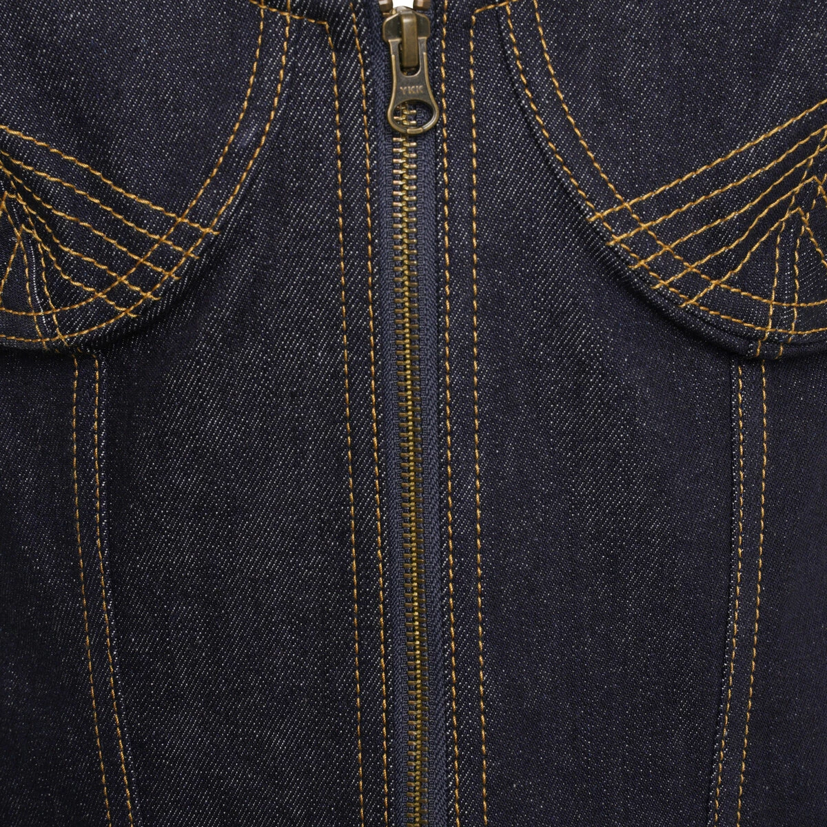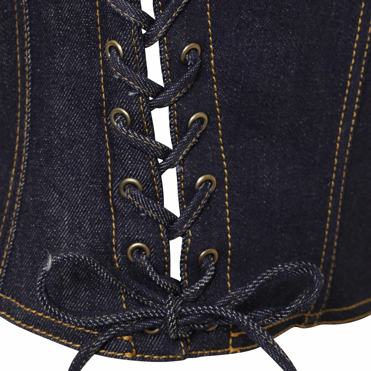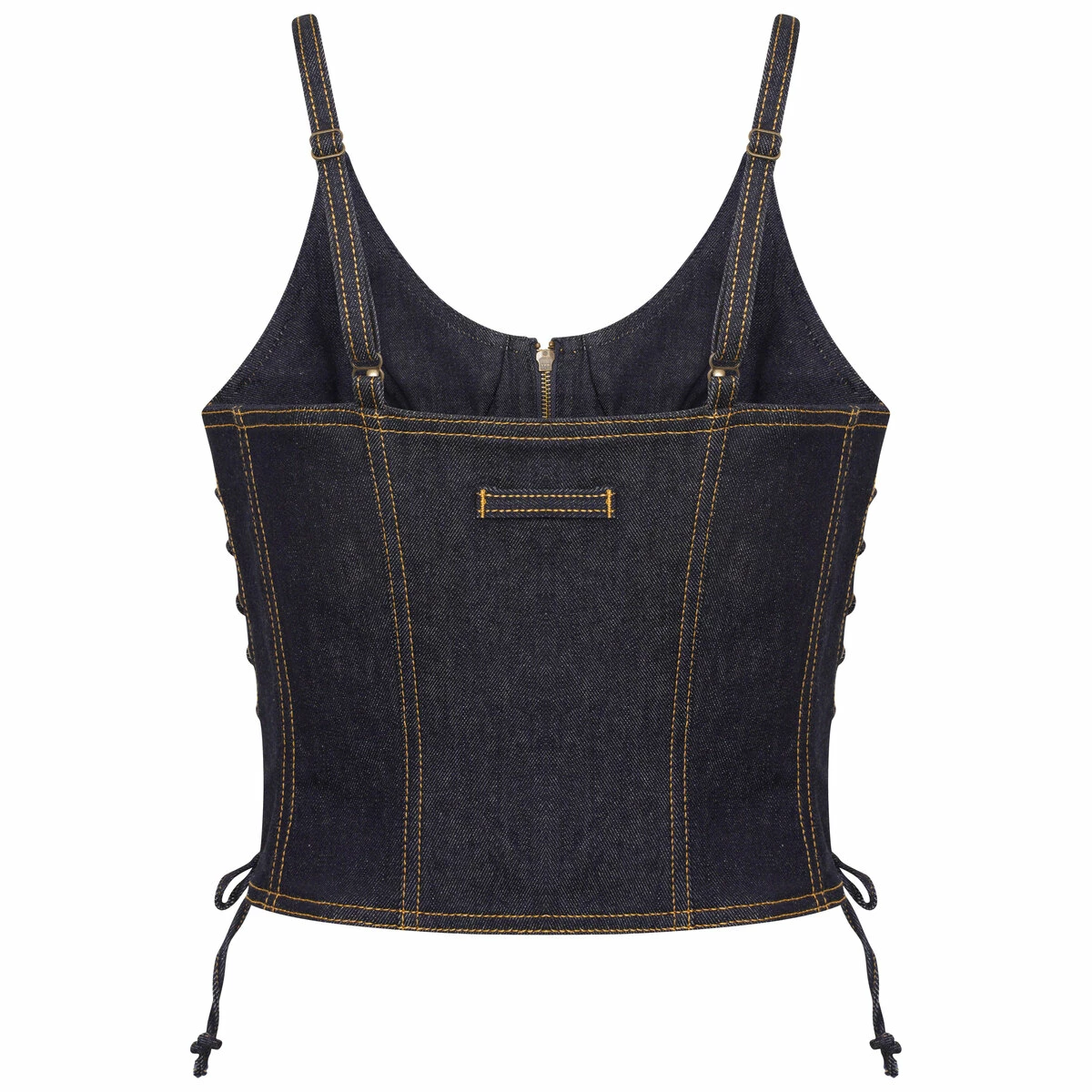 This denim corset is slim-fit with engraved JPG metallic rivets, contrasting lingerie cut-outs with lace-up sides, a metal zip fastening, and underwire below the chest.