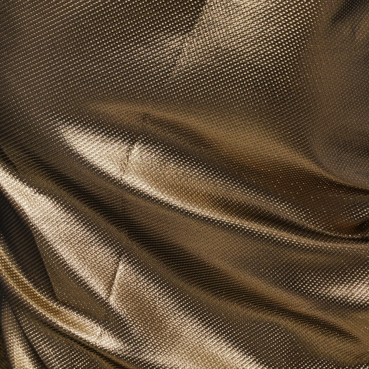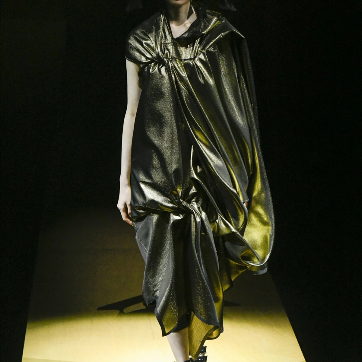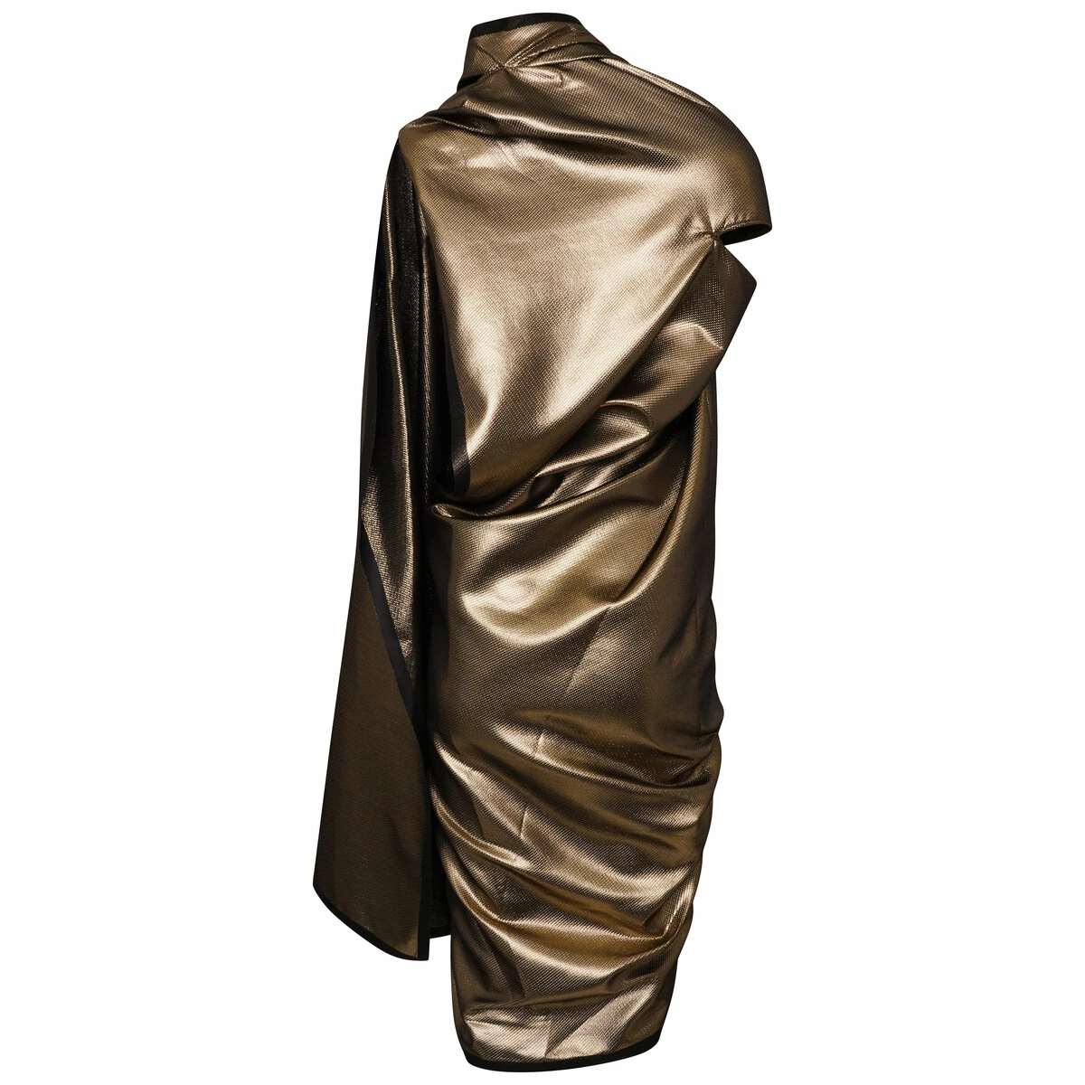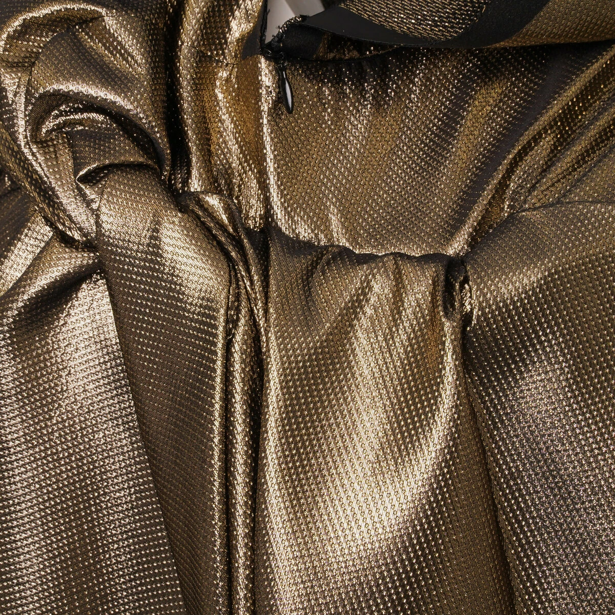 Junya Watanabe’s Black and Gold Tone Ruched Coat features an overall loose fit, and asymmetrical design with additional black detailing on the hem.