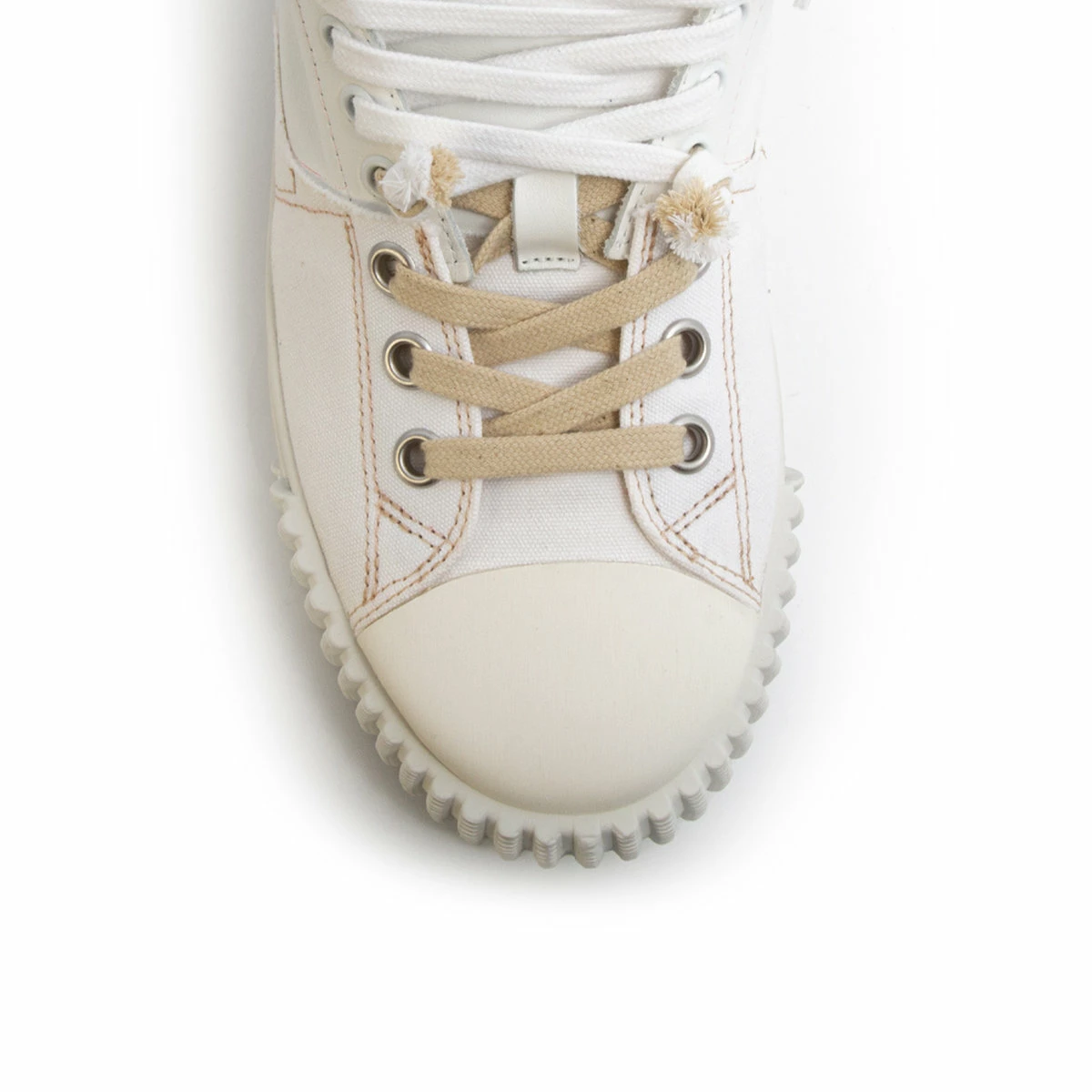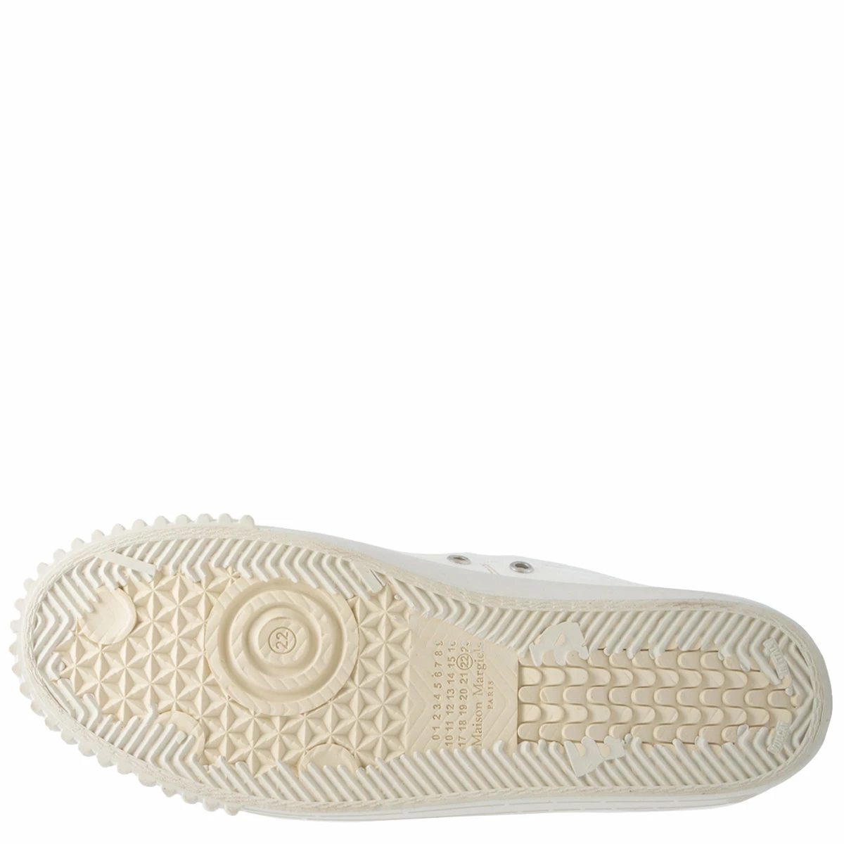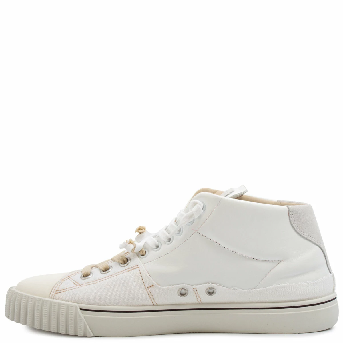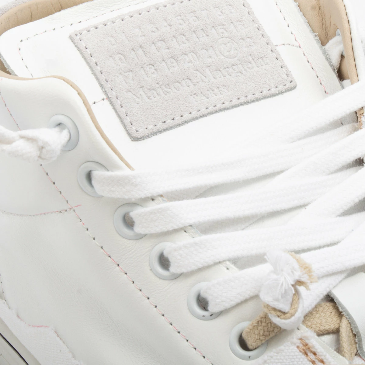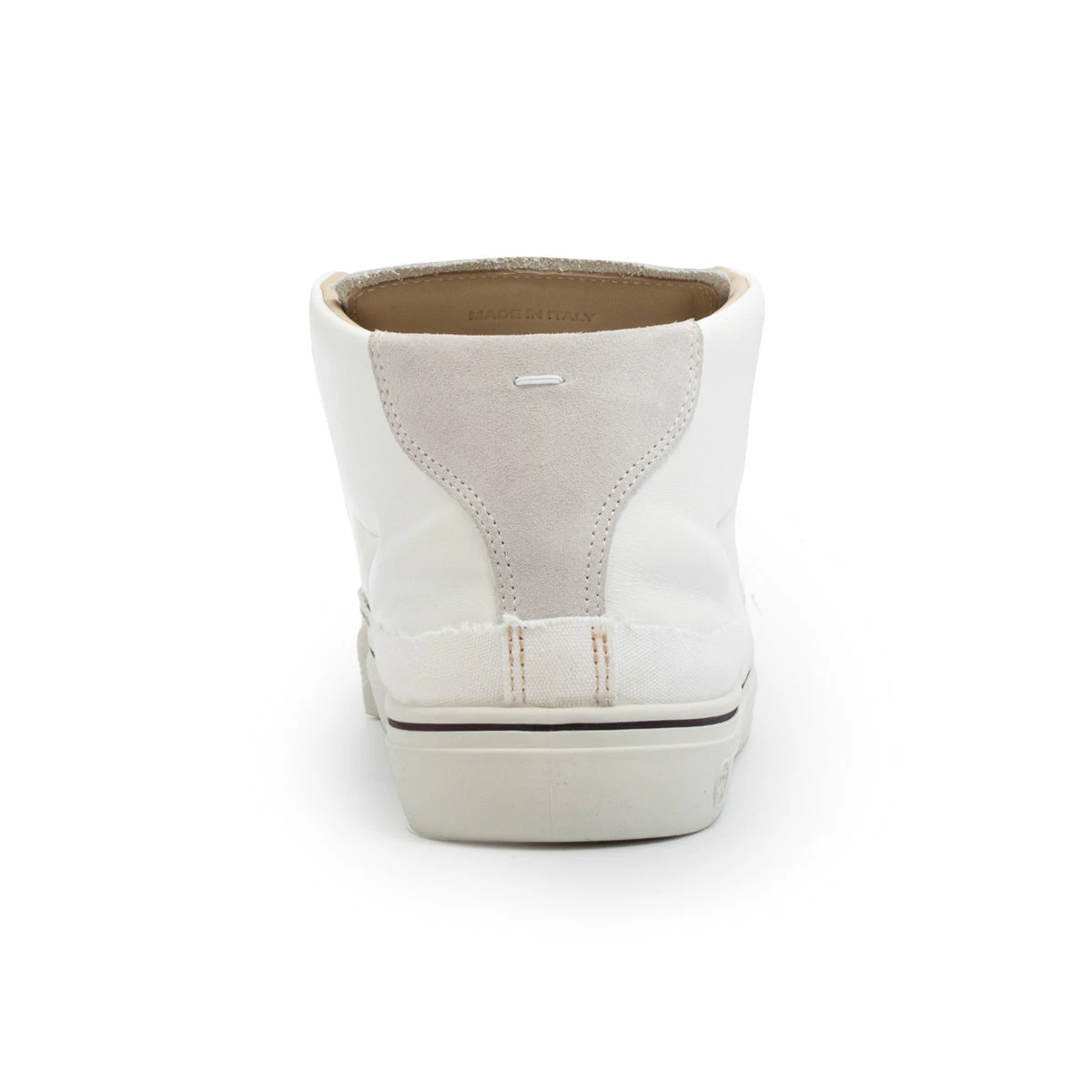 A classic street style from Maison Margiela, these high top sneakers feature a deconstructed canvas and leather upper with a lace-up fastening, distressed details, and a rubber sole. A suede logo patch on the tongue completes the casual look.