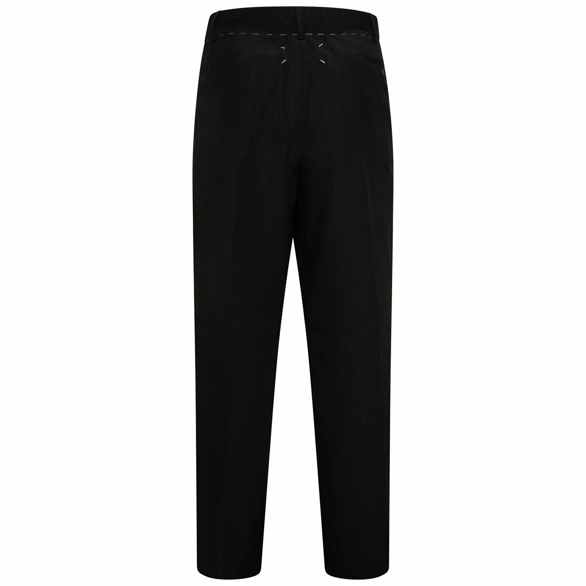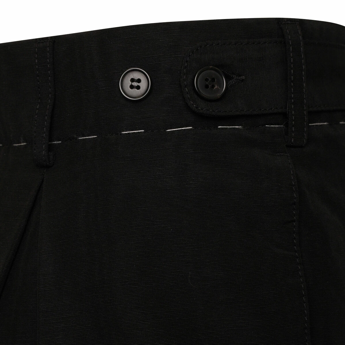 These smart/casual trousers in cotton moiré feature a drawstring waist with belt loops and side buttons for an adjustable fit, a concealed zip fly, wide leg, two side pockets, one back welt pocket, front pleats, and the signature work-in-progress stitching around the waist. Another Maison Margiela’s signature, the four stitches, appear at the back; opposite of a label.