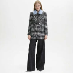 SELF PORTRAIT Boucle Check Faux Fur Collar Coat In Black | Designer Women’s Jacket